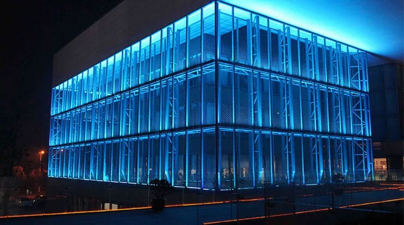 - Лучший вариант для оформления современных зданий, торговых, офисных и развлекательных центров – это цветная RGB-подсветка: всегда привлечет максимальное внимание. Использование динамического управления цветом (DMX) позволит настроить любой динамический эффект сочетания и переливания различных цветов.