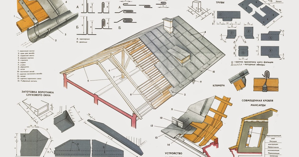 Настенные желоба образуются отгибами стальных листов, соединенных между собой лежачими фальцами. Желоба укрепляют стальными крючьями, прибитыми к обрешетке поверх свеса кровли и расположенными по длине карниза через каждые 700 мм. Минимальный уклон желобов принимается 4 — 5; высота борта — не менее 100 мм. [3]